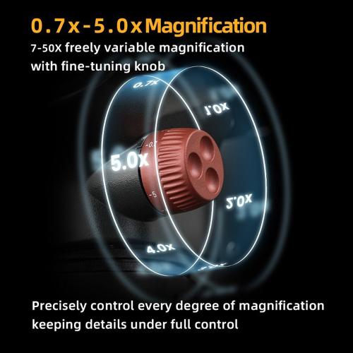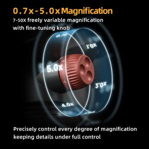 - Zoom Continuo 7X - 50X: Potente sistema di ingrandimento variabile che si adatta a qualsiasi esigenza, dall'ispezione generale alla saldatura di precisione.