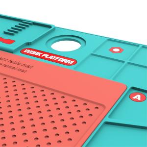- Il tappetino è dotato di numerosi scomparti, aree di posizionamento (etichettate A e B) e un'ampia area di lavoro testurizzata per tenere tutto in ordine e a portata di mano.